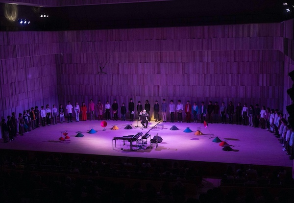 テリー・ライリー《NIJINOWA》舞台上のコーラス。中央に座っているのがテリー・ライリー(撮影:三浦麻旅子)