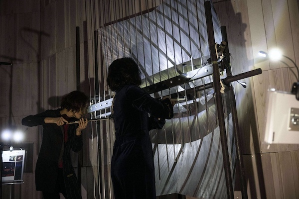 テリー・ライリー《NIJINOWA》。ホールの最上階でバシェ音響彫刻(渡辺フォーン)を演奏する岡田加津子(左)とSARA (撮影:三浦麻旅子)