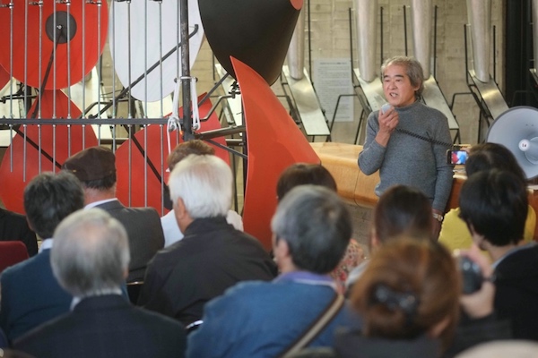 ところが、後年、このバシェ音響彫刻の修復をするようになってから、わかったことがありました。バシェさんのお友達で建築家のアラン・ヴィルミノさんという方がパリにいらっしゃって、この方は万博にフランソワ・バシェさんと一緒に来られて、音響彫刻を作った方なんです。もうかなりご高齢でしたが、京都市立芸術大学で修復した時にいろいろアドバイスしてくださったんです。バシェ修復のきっかけをつくってくれた打楽器奏者の永田砂知子さん(バシェ協会初代会長)と在仏のお姉さん宮崎千恵子さんが、ヴィルミノさんと度々連絡を取っておられたんですが、「ヴィルミノさんが、パリで武満さんの『四季』が演奏された時に拍手がなかった、って言ってる」というんですね。
