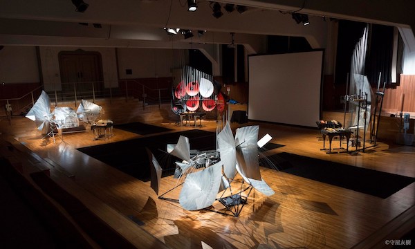 2015年京都芸術センターでの武満徹『四季』公演のためのセッティング。奥左から、高木(関根)フォーン[山口恭範]、川上フォーン[永田砂知子](奥中央)、渡辺フォーン[中谷満](奥右)、手前中央は、桂フォーン[宮本妥子] (撮影:守屋友樹 写真提供:京都芸術センター)*[ ] 内は演奏者名。