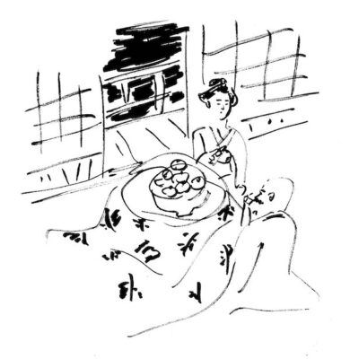 「くだもの」には「御所柿(ごしょがき)を食いし事」という話も載っている。子規が病を推して奈良を訪れた際、これまたすでに夕飯を食べ終えたあと、宿屋の下女に御所柿を頼んだら直径一尺五寸、というから四、五十センチはありそうな丼鉢に「山の如く」柿が盛られてきた。柿をむいてくれる女のややうつむいている顔がほれぼれとするようで、柿もうまい、場所もいい、と、ボーンと釣鐘が鳴る。女が「オヤ初夜が鳴る」と言いながら、さらに次の柿をむきつづけている。