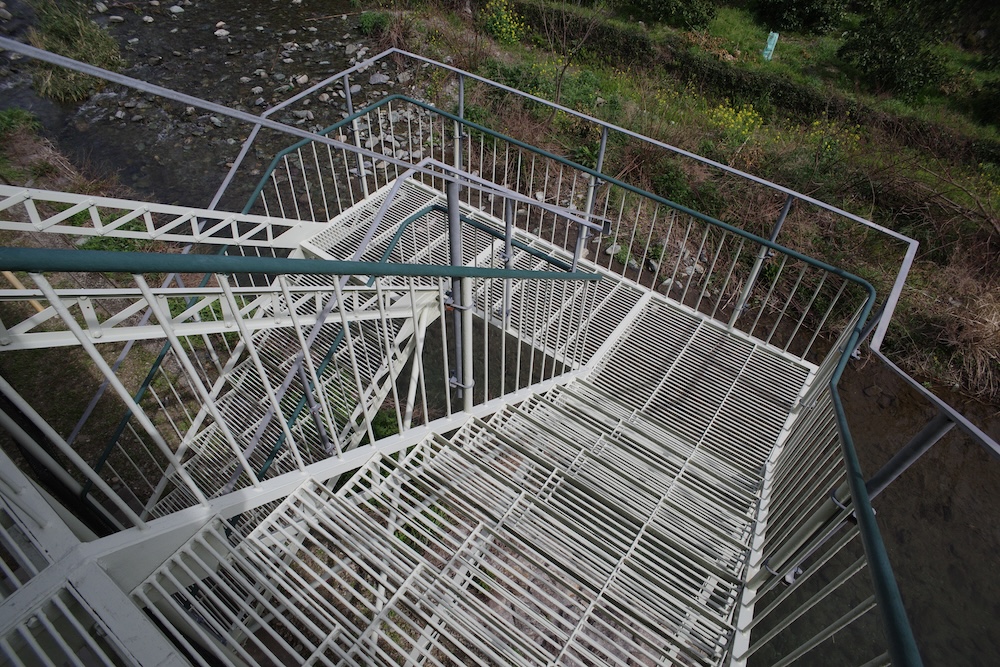 一見、遊び心で取り付けられた階段のようにも見えるのですが、この階段には大事な役割があります。「東校舎」2階には教室が3つ並んでいるのですが、教室前の廊下は教室部分よりも短くて、東端の教室は手前側にしか扉がありません。教室には避難扉が2つ以上必要ですが、廊下側には1つしか設けられなかったので、反対の川側に屋外階段を設けることで二方向避難の条件を満たしているのです。