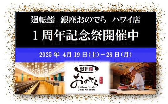 株式会社ONODERAフードサービス(代表取締役社長:小野寺 勇司 所在地:東京都千代田区)が運営する「廻転鮨 銀座おのでら ハワイ店」(アメリカ合衆国ハワイ州オアフ島ホノルル)は、2025年4月19日(土)~4月28日(月)(現地時間)の間、「オープン1周年記念祭」を開催いたしておりますのでお知らせいたします。