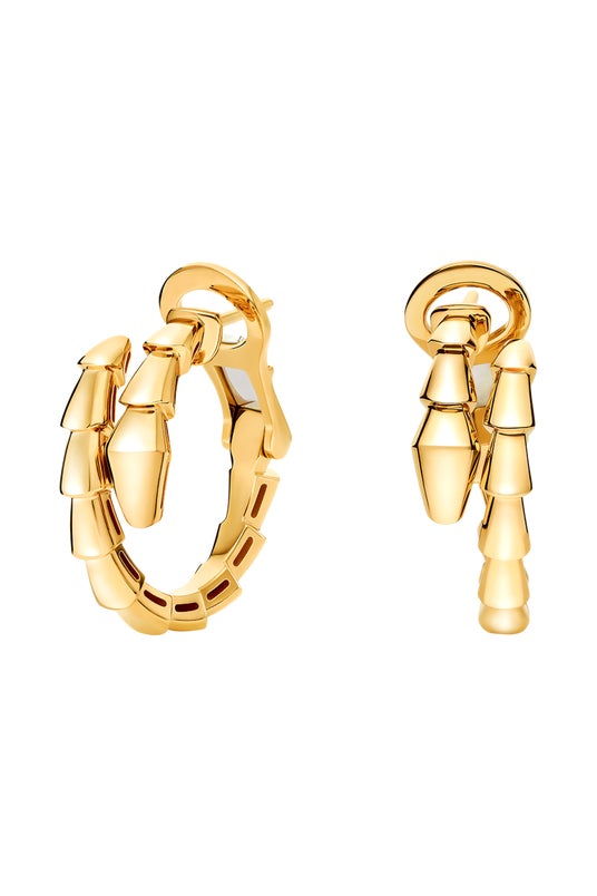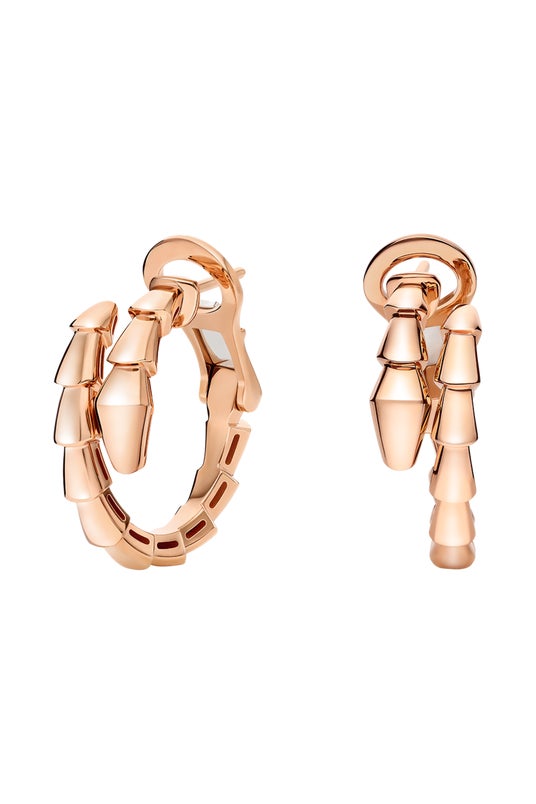 アイコニックな蛇の頭部が尾の上にエレガントに乗ったつややかなネックレスと、印象深いデザインで付けやすいフープピアスがセットになった「セルペンティ ヴァイパー」の新作は、ピンクゴールドとイエローゴールドの2色からお選びいただけます。この新しいゴールドカラーの魅力を通して、ブルガリらしいデザインの進化を体現しています。