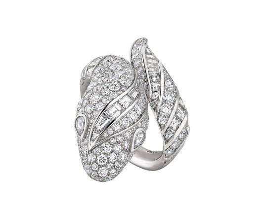 ピンクゴールドにさまざまなサイズのダイヤモンドをふんだんにあしらったこのジュエリーは、サファイア、ルビー、エメラルドの粒を蛇のボディとお揃いの瞳の部分にあしらいました。また、ホワイトゴールドにフルダイヤモンドをセットしたリングは、バゲットカットとブリリアントカットのジェムストーンが究極の輝きを放ち、見る人を魅了します。