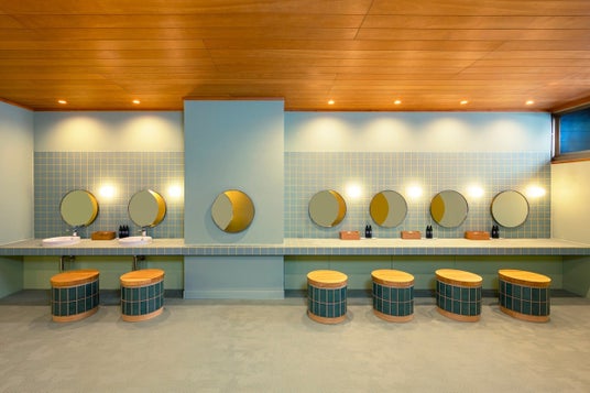 大浴場のエントランスは、リゾナーレ熱海から見えるムーンロードをライティングやモザイクアートで表現します。さらに、脱衣所には月の満ち欠けを表現した鏡を設置。浴場内だけでなく、エントランスから脱衣所に至るまでムーンロードや月の満ち欠けを存分に堪能できます。温泉文化から着想を得た脱衣所のタイルの色味には、浴場内の青味がかった石の色と一体感のある青磁グリーンを使用。脱衣所から浴場内まで、月を表現したシームレスなデザインに進化しました。