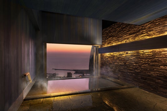 高台に位置するリゾナーレ熱海からは、熱海を一望できます。特に半露天風呂は、水盤が外に向かって突き出ているため、まるで海に浮かんでいるような感覚で絶景を堪能できるのが特徴です。また、ミッドナイトブルーで塗られた壁が海の色や揺らめきを表現していることにより、朝焼けから夜景まで移り行く熱海の景色がさらに際立ち、その美しさに没頭することができます。