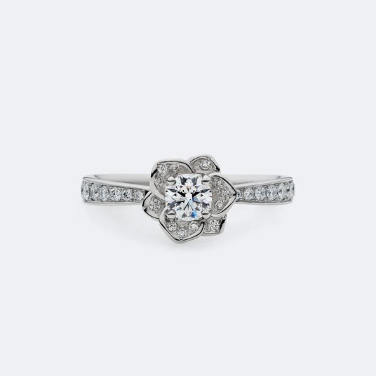 上品に咲き香る、気高き白いバラをイメージし、美しいセンターダイヤモンドを優しく花びらで包み込んだデザイン。