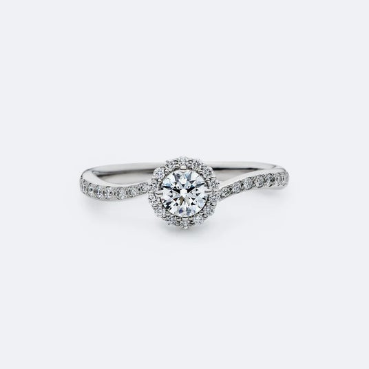 センターストーンの周囲をメレダイヤモンドで優しくふちどった、優美で気品あふれる印象のエンゲージメントリング。
