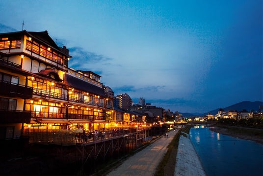 鴨川沿いに存在感を示す、五層楼閣の建物。鮒鶴京都鴨川リゾートは、かつて老舗料理旅館として愛された「鮒鶴」をレストラン&バンケットとして再生したユニークべニューです。「鮒鶴」は明治3年に創業し、大正14年に現在の場所に移転。京都鴨川のランドマークとして100年以上の歴史を誇る純和風建築は、2012年に国の登録有形文化財に指定されています。