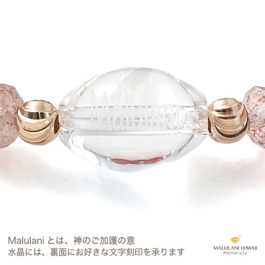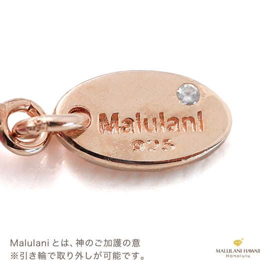 ジルコニアがキラリと輝くオリジナルチャームと水晶には、ハワイ語で「神のご加護」の意味を持つ 「Malulani」と刻印。
