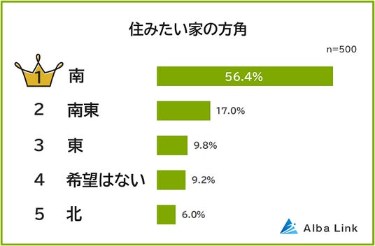 株式会社AlbaLink(本社:東京都江東区、代表取締役:河田 憲二)は、全国の男女500人を対象に「住みたい家の方角に関する意識調査」を実施し、そのデータをランキングにしました。