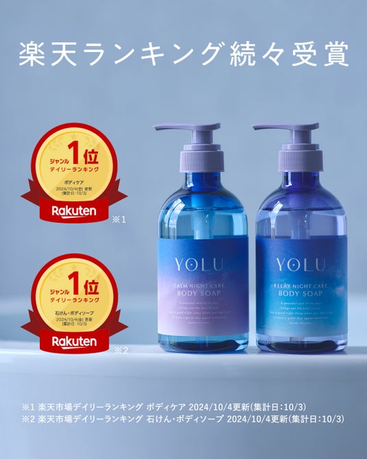 さらに、ナイトケアボディソープは楽天市場発売初日でデイリーランキングの2カテゴリ(ボディケア、石鹸けん・ボディソープ)で1位を獲得し、YOLUのボディケアシリーズは合計で6冠*を達成しました。
