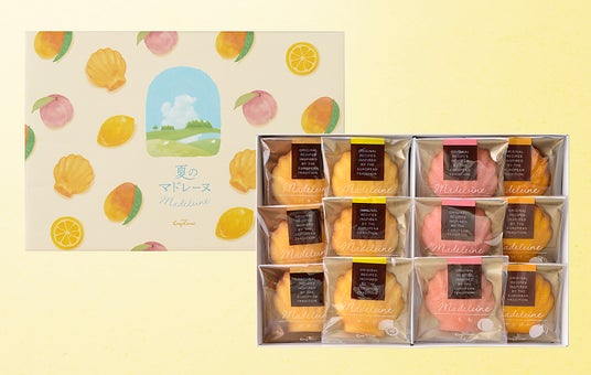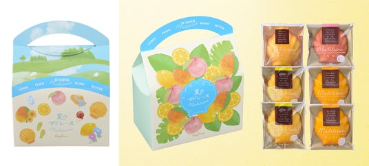 国産バターとたっぷりの卵を使ってしっとり焼き上げた「バターマドレーヌ」、岡山県産の桃「白鳳(はくほう)」の芳醇な甘み&香りが広がる「ももマドレーヌ」、広島県産瀬戸内レモンのすがすがしい甘ずっぱさが広がる「レモンマドレーヌ」、アルフォンソマンゴーの華やかな香りとほんのり甘ずっぱさが広がる「マンゴーマドレーヌ」。季節限定の味わいと人気のマドレーヌを、夏をイメージしたデザインのパッケージにアソートしました。
