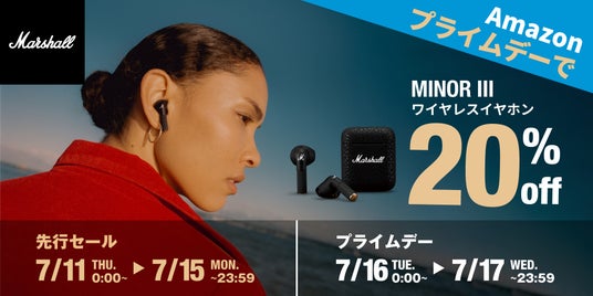 完実電気株式会社はAmazonで2024年7月11日(木)0:00から7月15日(月)23:59まで開催される「プライムデー先行セール」および、7月16日(火)0:00から7月17日(水)23:59まで開催される「Amazon プライムデー」において、Marshallの人気完全ワイヤレスイヤホン《Minor III》を20%OFFにて販売します。