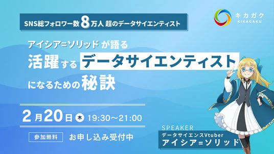 人工知能‧機械学習を含めた先端技術に関する教育事業を展開する株式会社キカガク(本社:東京都渋谷区、代表取締役社長:大崎 将寛)は、SNS総フォロワー数8万人を誇るデータサイエンスVTuberアイシア=ソリッド氏をゲストに迎え、コラボウェビナーを開催します。
