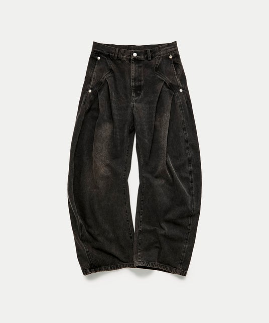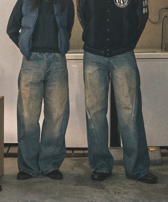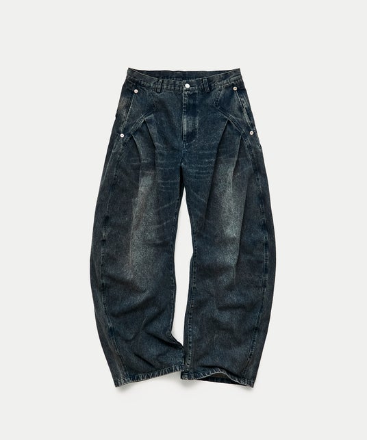 NVRFRGTを代表するシグネチャーアイテムである、即完売した“DIRTY FADED INDIGO”カラーをCONZ限定で復刻いたしました。立体裁断デニムから着想した新型3Dツイストワイドデニムパンツです。人間工学に基づいた立体裁断で3Dパターンメイキングを駆使しています。膝や足回りの動きやすさを解放する為にサイドシームが大きく捻じれたデザインが特徴です。サイドシームを二重に入れる事で視覚、構造共に立体的なシルエットを強調しています。