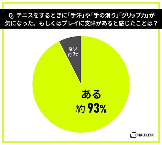 テニスの最中に手汗や滑りが気になった人は約93%と、かなり高い割合で気になっていることがわかりました。