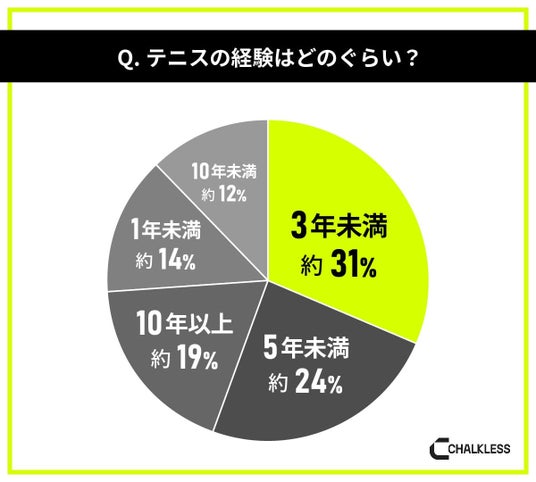 今回は全体として30~40代、女性の回答者が若干多かったです。また、経験年数は5年未満までの層が多く、オフシーズンを除いて色々な気候シーンでテニスをプレイした人の回答となっています。