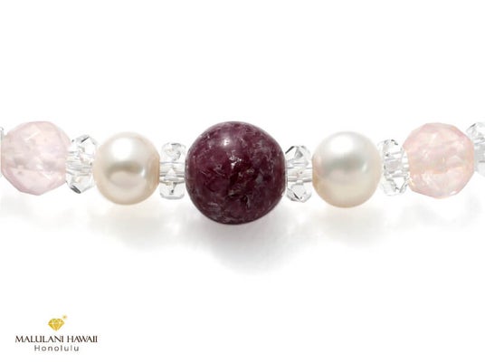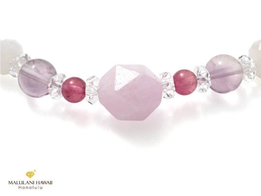 第一弾で発売する「フラ~月の女神~」は、慈愛に満ちた女神の石クンツァイトを冠に、ローズクォーツやピンクトルマリン、ムーンストーンなど、優しく女性らしい愛の石をセレクトしたブレスレット。