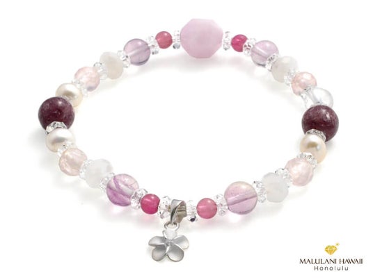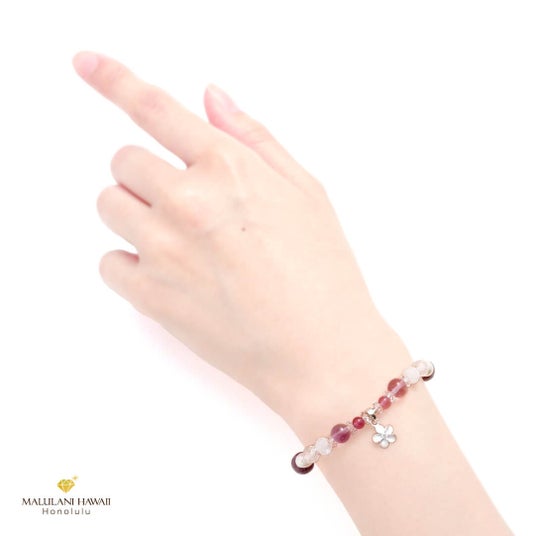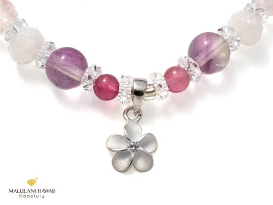 大切な女性に贈るお守りとされるプルメリアのハワイアンジュエリーをプラスし、新たな始まりを祝福するときにも相応しいブレスレットとなりました。