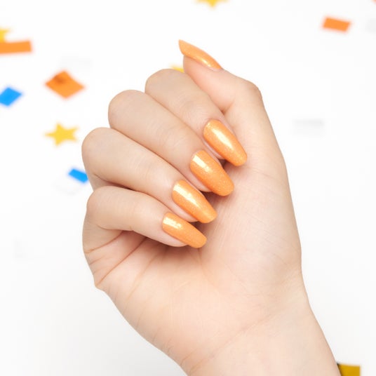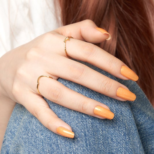 柔らかなオレンジ色に、微細な偏光ラメを散りばめたグリッターネイルです。ほんのりパールがかったパステル調のオレンジは肌色に馴染みやすく、爪の短い方にもオススメ。指先をスッキリと美しく見せてくれるカラーです。対人運UPの色とも言われるオレンジカラーを身に着けて、ポジティブな縁を引き寄せましょう。