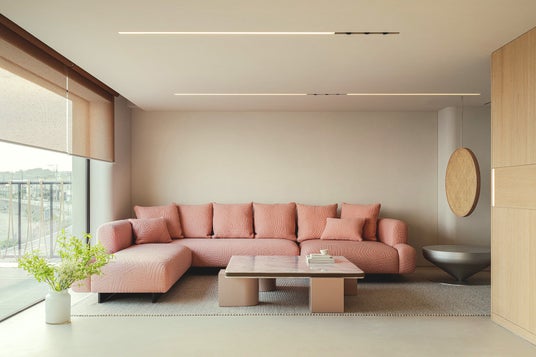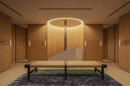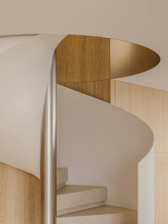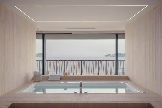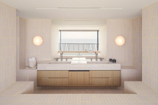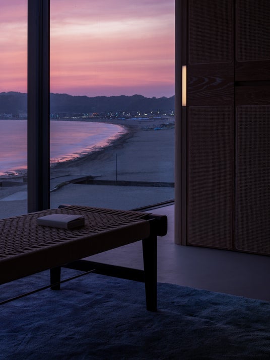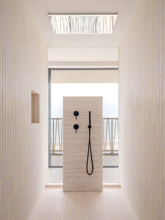 3Fは非常にユニークなレイアウトです。 階段を登ると、そこにはオープンクローゼットがあります。 洋服を纏うことがライフスタイルの中心であることの象徴となるように、明るくオープンな場所となるように、建物の中央に配置しています。海との一体感を感じるオープンなバスルームは3Fの半分近くを占めます。シャワールーム、バニティーカウンターからバスタブまで、水と関わるためのスペースがシームレスに繋がっていきます。 ファッションが布と糸でデザインを楽しむことであるように、オリジナルで製作をしたピンクのタイルに、黄色い目地を流しました。全ての家具はクライアントから感じる一人のキャラクターを意識してデザインしました。凛とした佇まい、優雅な姿、ピュアな発想、それらが美しく調和しています。