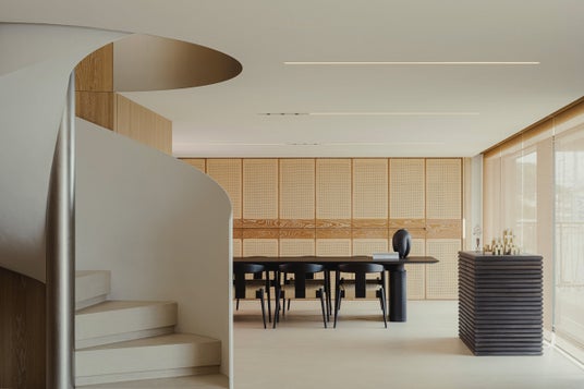 2階はリビングからダイニングまでつながる空間全体に海からの光が入っていきます。 チタンのボリュームのある扉を開くと、テラスからのエントランスとなります。単調な一繋がりの開口とするのではなく、あえて間にボリュームをはさむことで、 空間に外光のリズムが生まれ、リビング・ダイニング空間の感覚を生み出しています。 ラタンで作られたキッチンやクローゼットの扉は光や風を通す軽やかなデザインです。 編むという行為で作られたラタンからは、洋服を作るような手仕事の雰囲気を感じさせます。