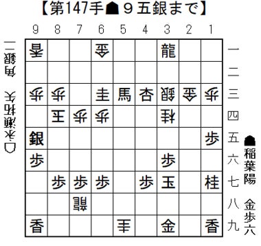 ▲6三桂成 △8四玉 ▲9五銀 まで147手で先手の勝ち