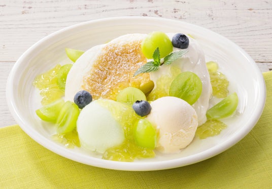しっとり食感に冷やしたパンケーキにシャインマスカット果実をトッピング。