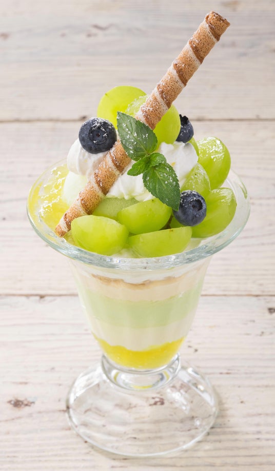 シャインマスカットジュレ、マスカルポーネを使ったクリーム、ヨーグルト、マスカット・オブ・アレキサンドリア果汁を使用したシャーベットを重ねて、シャインマスカットの果実をトッピングした贅沢なパフェです。