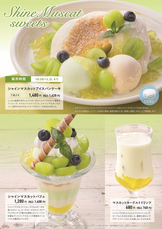 人気のパンケーキの季節限定メニュー「シャインマスカットアイスパンケーキ」をはじめ、シャインマスカットを贅沢にトッピングした「シャインマスカットパフェ」、デザートドリンクとしてお楽しみいただける「マスカットヨーグルトドリンク」をご用意しています。