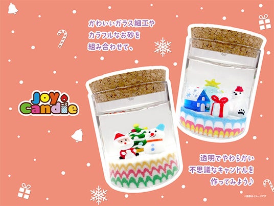 ライトアップグラスにカラフルな砂を積み重ねサンドアートを楽しみ、最後にお気に入りのサンタ、ツリー、トナカイなどガラス細工をトッピングしたら完成!