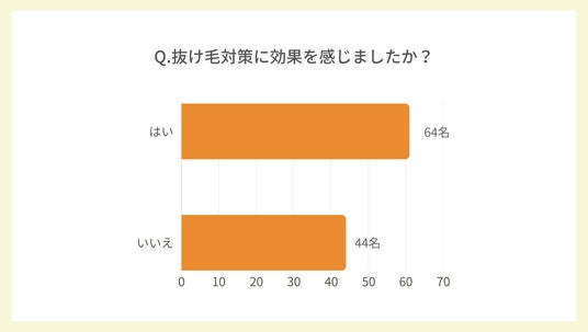アンケートでは、抜け毛対策に取り組んでいる方105名を対象に「抜け毛対策に効果を感じましたか?」と尋ねました。その結果「はい」と回答した方は61名で、「いいえ」と答えた44名をわずかに上回る結果となりました。