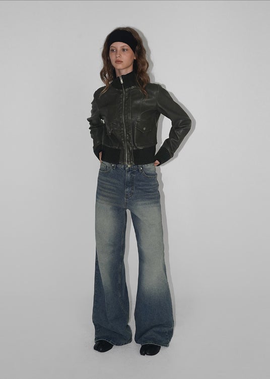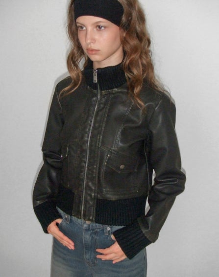 ユーズド感のあるスクラッチ加工を施した、ヴィンテージライクなレザー風ジップアップブルゾン。