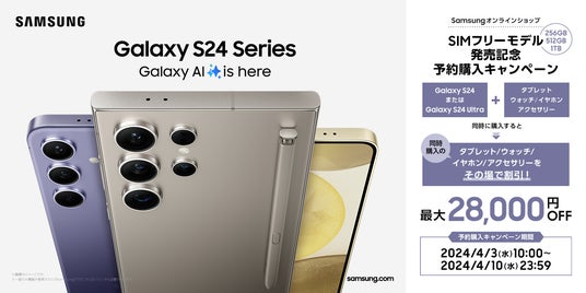 Samsungオンラインショップで「Galaxy S24(SM-S921Q)SIMフリー」「Galaxy S24 Ultra(SM-S928Q)SIMフリー」の予約購入と同時にタブレットやスマートウォッチ、イヤホン、アクセサリーなどのSamsung製品(スマートフォン端末は含みません。以下「同時購入品」とする)を購入すると、同時購入品が最大28,000円値引きされる特典が受けられます。