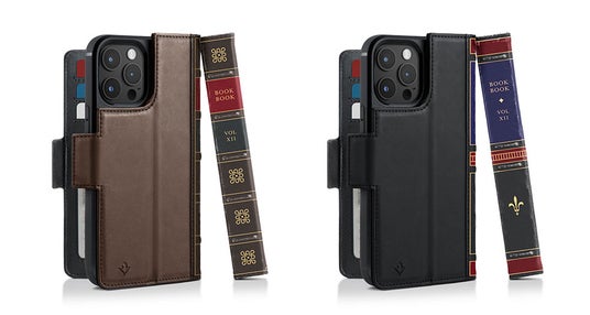 MagSafe充電器対応のiPhone15シリーズ用フルグレイン本革レザーケース、ヴィンテージ洋書風ハードカバーはリアル財布機能搭載、そして折りたたみ式ディスプレイスタンドに変形。ブラウン、ブラックの2色展開。