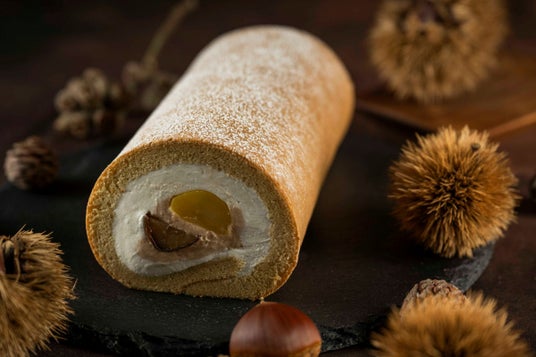 ●<ベビーモンシェール>季節の堂島ロール~マロンロング 2,376円/ハーフ 1,350円/カット 540円/2色の栗(黄栗・渋皮付栗)とまろやかなマロンクリームを、生乳のコクと香り広がるクリームと一緒にマロンペーストを練りこんだ生地で包みました。