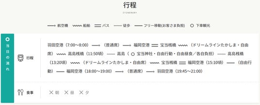 羽田空港発着、全行程に添乗員同行で安心、福岡空港から船着き場までは貸切バスの移動で快適にご移動いただけます。また、高島および福岡空港ではそれぞれ自由時間があります。 高島では宝当神社参拝や島内散策、福岡空港では空港周辺の観光などもお楽しみいただけます。3 申込方法