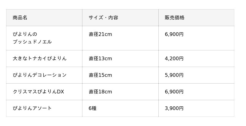 今年は、毎年ご好評いただいている「ぴよりんデコレーション」「クリスマスアソート」、昨年お休みして一年ぶりに復活する「クリスマスぴよりんDX」に加え、2019年以来6年ぶりに登場する「ブッシュドノエル」、そしてクリスマスシーズンを彩る初登場の「大きなトナカイぴよりん」がラインナップ。冬の夜空に咲く花のように、可憐で温かみのある特別なクリスマスを演出するコレクションです。