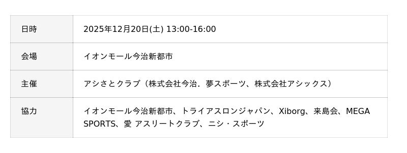 株式会社今治.夢スポーツ/FC今治は、株式会社アシックスと協働で運営する「アシさとクラブ」によるパラスポーツフェスティバルを2025年12月20日(土)にイオンモール今治新都市にて開催します。
