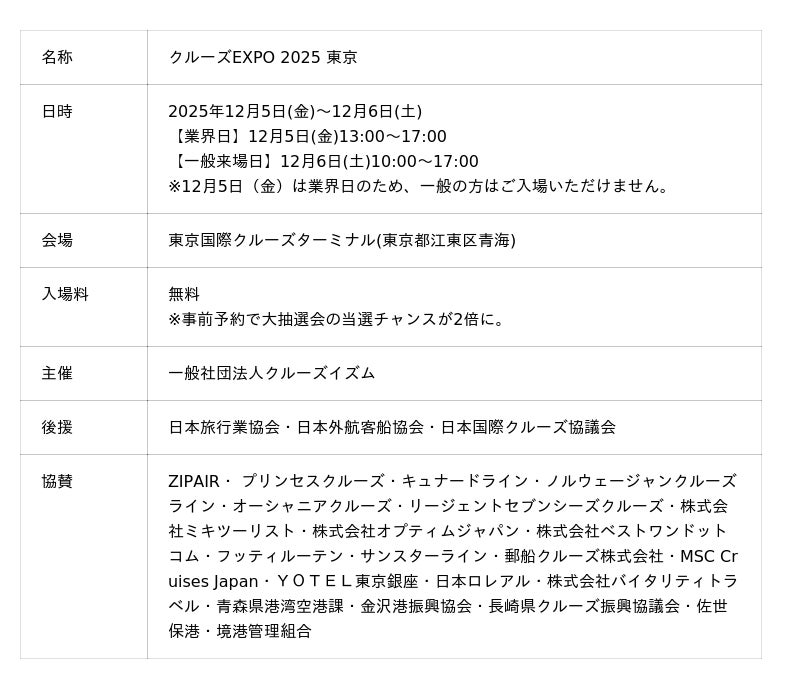 インフルエンサー起用によるクルーズ特化型トラベルメディア、一般社団法人 クルーズイズム(本社:東京都江東区、代表理事:久野 健吾)が事務局を務める「クルーズEXPO 2025 東京」実行委員会は、2025年12月5日(金)~6日(土)の2日間、東京・お台場の東京国際クルーズターミナルにて「クルーズEXPO 2025 東京」を開催します。