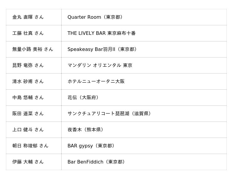 味わい・バランス・創造性・テーマ性などを総合的に評価し、次世代を担うバーテンダーたちの個性豊かなレシピが寄せられた中から選出された、10名のファイナリストです。(順不同)