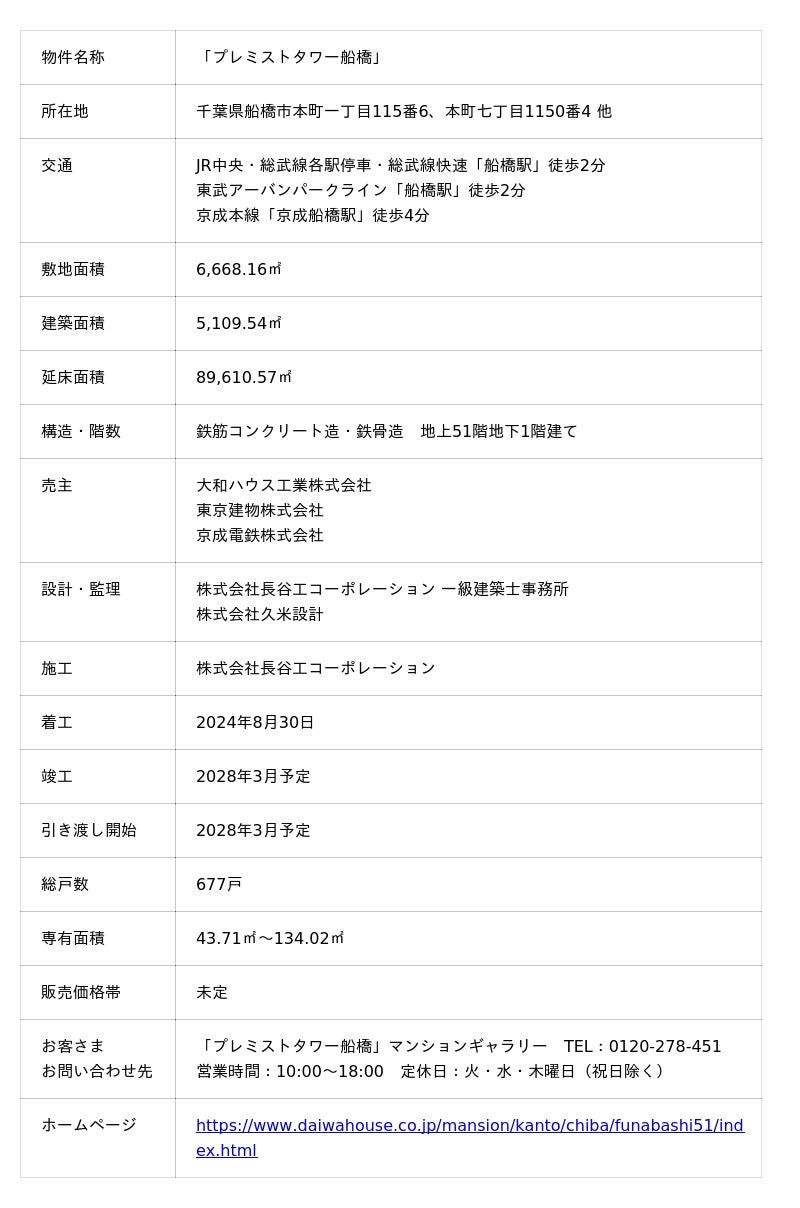 大和ハウス工業株式会社(本社:大阪市、社長:大友浩嗣)は、東京建物株式会社と京成電鉄株式会社と共同で、千葉県船橋市の「西武船橋店本館」跡地において、分譲マンション「プレミストタワー船橋」(地上51階・地下1階建て、総戸数677戸)を建設中ですが、概要が決定しましたのでお知らせします。