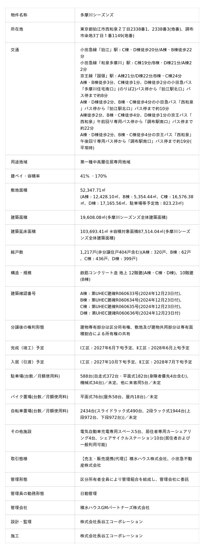 積水ハウス株式会社(本社:大阪市北区/代表取締役兼CEO 社長執行役員:仲井 嘉浩、以下「積水ハウス」)、小田急不動産株式会社(本社:東京都渋谷区/取締役社長:五十嵐 秀、以下「小田急不動産」)および株式会社長谷工不動産(本社:東京都港区/代表取締役社長:松本 健、以下「長谷工不動産」)、株式会社長谷工コーポレーション(本社:東京都港区/代表取締役社長:熊野 聡、以下「長谷工コーポレーション」)が参加組合員として事業に参画し、多摩川住宅ニ棟団地マンション建替組合(理事長:大谷 啓史)、コンサルタントの株式会社ユーディ都市建築研究所(東京都港区/代表取締役:柴田 恒秀)と共に推進する「多摩川住宅ニ棟団地マンション建替え事業」において、新たに誕生する新築分譲マンション「多摩川シーズンズ」(以下「本物件」)のモデルルームを11月8日に開設することをお知らせいたします。