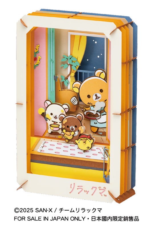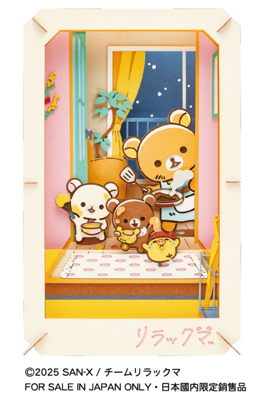 「PAPER THEATER」シリーズに、ショートアニメ「リラックマ」の新商品が登場! 2026年4月よりテレビ放送開始予定のショートアニメ「リラックマ」を記念し、Production I.Gによる描き下ろしイラストを使用しています 。玄関でホットケーキを焼きながらお出迎えするリラックマたちの姿を、ペーパーシアターならではの、奥行きと重なりで表現した、心温まるデザインです。リラックマがずっと大好きな「ホットケーキのルーティーン」を描いたイラストは、ファン必見です。組み立てて飾ることでインテリアとしても楽しむことができますので、是非作って飾って、リラックマの可愛さに癒されてください。
