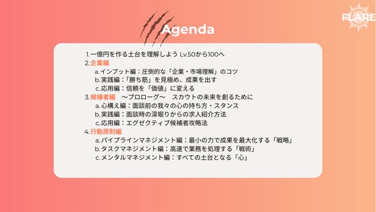 その根底にあるのが、起業時に大橋自身が作成した社内研修資料「Flare虎の巻~一億円の作り方~」です。自社内で営業メンバー向けに運用していたこの資料を、業界コミュニティ「エージェントごった煮会」での登壇時に共有したところ大きな反響を得ました。