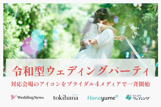 全国296式場が令和型ウェディングパーティの案内を開始。本日より、ウェディングニュース、トキハナ、みんなのウェディング、ハナユメ、4メディアでアイコン表示を開始。