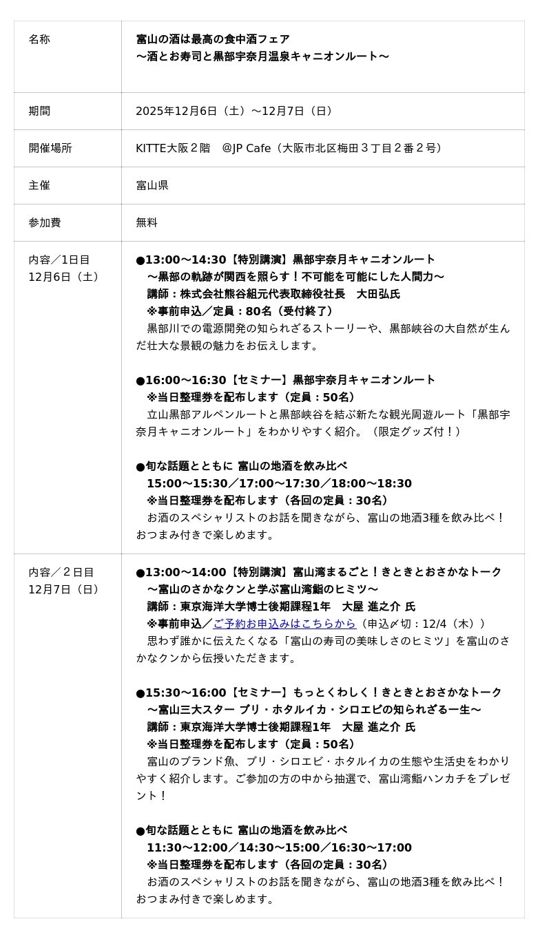 さらに、フェア期間中の12/6(土)・7(日)には、同じフロアにある@JP Cafe(大阪梅田・KITTE大阪 2F)にて、「地酒飲み比べ」や「富山のさかなくん」から富山湾鮨の秘密を教えてもらう「きときとおさかなトーク」などのイベントも開催します。地酒や富山の食文化、観光などをテーマに、思わず富山に行きたくなる情報を提供します!