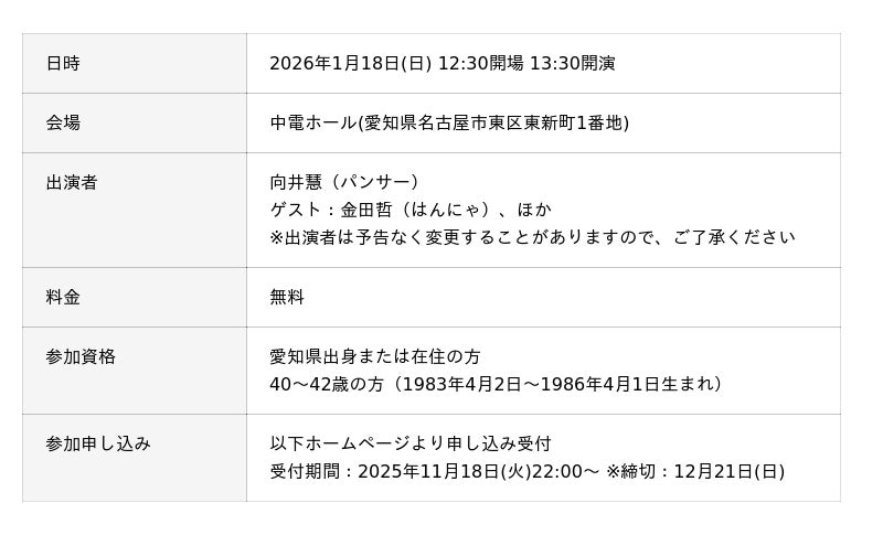 本企画は、パンサー向井さんが同級生で元相方の近藤裕希さんとともに発起人となり、2026年1月18日(日)に中電ホール(愛知県名古屋市)にて実施するものです。